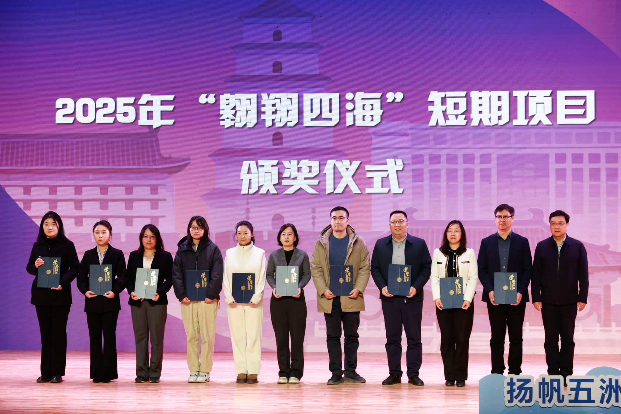 在2025年“翱翔四海”项目获奖单位颁奖仪式上,文通为航空学院、航天学院、航海学院、材料学院、自动化学院、数学与统计学院、教育实验学院、玛丽女王工程学院、民航学院、国家大学科技园、党委学生工作部等获奖单位代表颁奖,表彰其在学生出国(境)工作中的突出成效。