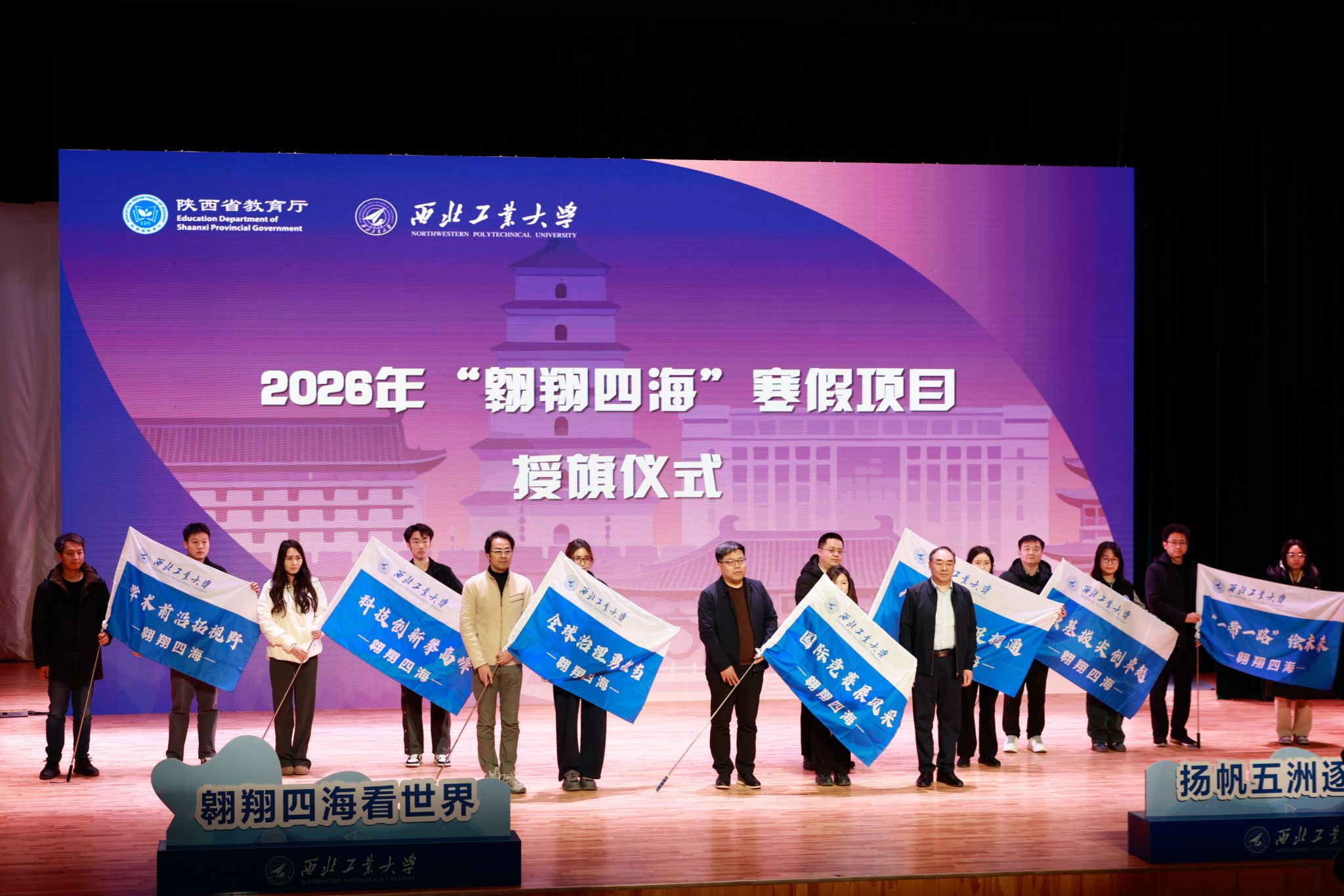 岳晓奎为2026年“翱翔四海”寒假项目代表授七大主题旗帜。计算机学院、化学与化工学院、公共政策与管理学院、生命科学与技术学院、外国语学院、集成电路学院、柔性电子研究院代表上台接旗,标志着本年度寒假项目正式启动。