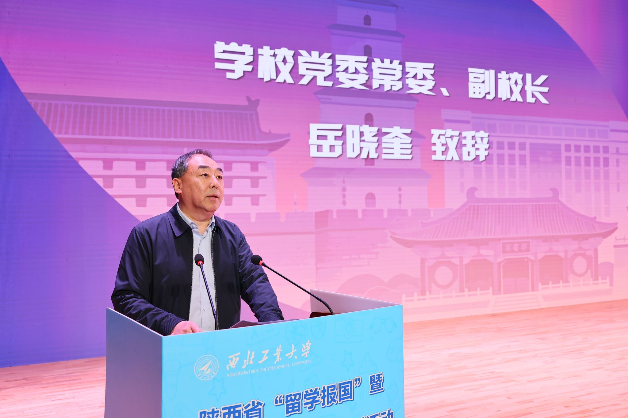 岳晓奎致欢迎词,对陕西省教育厅及社会各界长期以来给予学校的关心与支持表示诚挚感谢,并对青年学生成长和国际交流工作寄予了殷切期望。他指出,学校始终以服务国家战略需求为导向,以“翱翔四海”为牵引搭建学生拓展国际视野的优质平台,着力培养兼具全球化思维与责任担当的“总师型”拔尖创新人才。他勉励同学们锚定报国初心、筑牢家国根基,拓宽全球视野、勇担交流使命,锤炼卓越本领、践行铸剑担当。