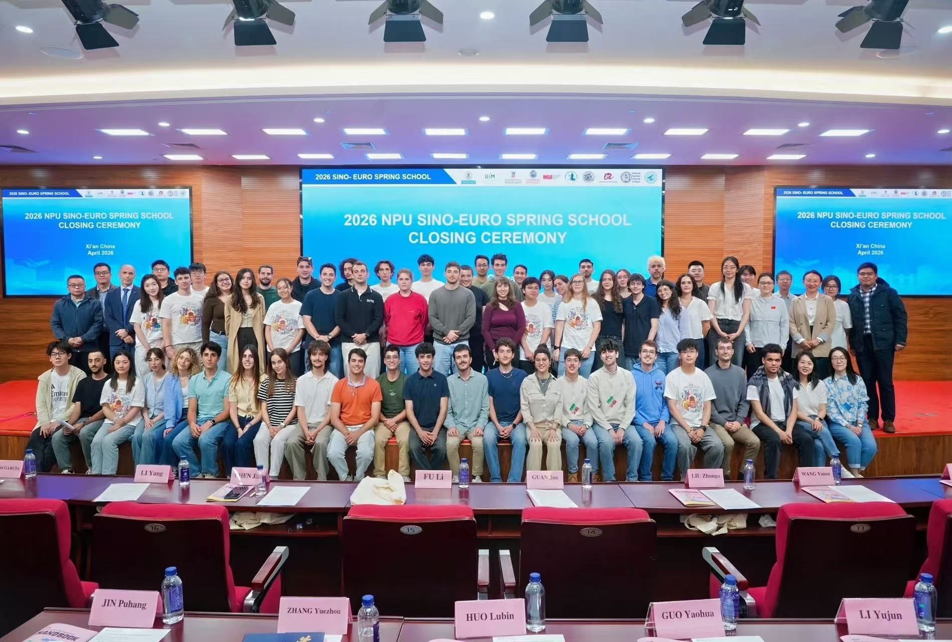 4月17日,西北工业大学2026年中欧春校闭幕式在友谊校区国际会议中心举行。来自我校及法国国立应用科学学院、西班牙巴塞罗那大学、西班牙马德里自治大学、西班牙马德里理工大学、意大利米兰理工大学及雅典国家技术大学等4个国家8所一流大学100余名师生参加闭幕式。党委学生工作部、研究生院、教务部、体育部、航天学院、机电学院、柔性电子研究院等单位代表出席活动。